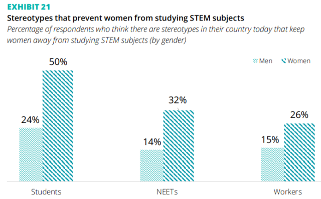 Così, molti ragazzi e ragazze rimangono intrappolati in vecchi stereotipi e sono frenati dal bias secondo cui le materie STEM sono più difficili e richiedono più tempo e risorse economiche. Oltre a questo, persiste l’idea che siano materie non adatte a tutti e, secondo alcuni, non adatte alle ragazze: la nostra ricerca evidenzia infatti che il 50% delle studentesse intervistate riconosce la presenza di stereotipi di genere che disincentivano le donne rispetto all’avvio di un percorso di studi in ambito STEM, mentre il dato scende al 24% se gli intervistati sono studenti maschi.