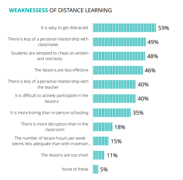 Altro tema rilevante è quello dell’efficacia della “didattica a distanza”. In media, solo il 36% degli studenti pensa che questa sia utile per la scuola secondaria. Più nel dettaglio, mentre il 52% ne riconosce l’utilità per evitare di perdere tempo nel tragitto casa-scuola e il 34% pensa che le lezioni siano più tranquille, il 59% afferma che è più facile distrarsi, il 49% lamenta l’assenza di contatto personale con i compagni, il 48% confessa di essere stato più tentato di copiare e il 46% pensa che, in generale, le lezioni siano meno efficaci. A complicare le cose, poi, ci sono le difficoltà di accesso a infrastrutture tecnologiche e a dispositivi elettronici – una criticità che non riguarda tutti allo stesso modo e che ha amplificato le disuguaglianze sociali.