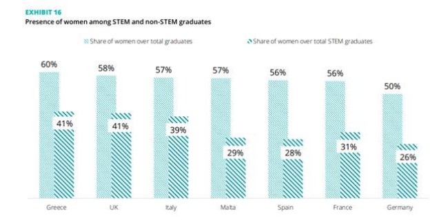 Nonostante la crescita di domanda di professioni STEM, l’educazione terziaria tecnico-scientifica è scelta da una minoranza degli studenti europei. Solo il 26% del totale dei laureati nei Paesi esaminati e circa il 15% delle donne possiede un titolo di studio di questo tipo. Una tendenza rimasta quasi inalterata negli ultimi 5 anni, in cui solo la Germania spicca per una più elevata percentuale di laureati STEM: 4 laureati tedeschi e 2 laureate tedesche su 10 possiedono un titolo di studio tecnico-scientifico.