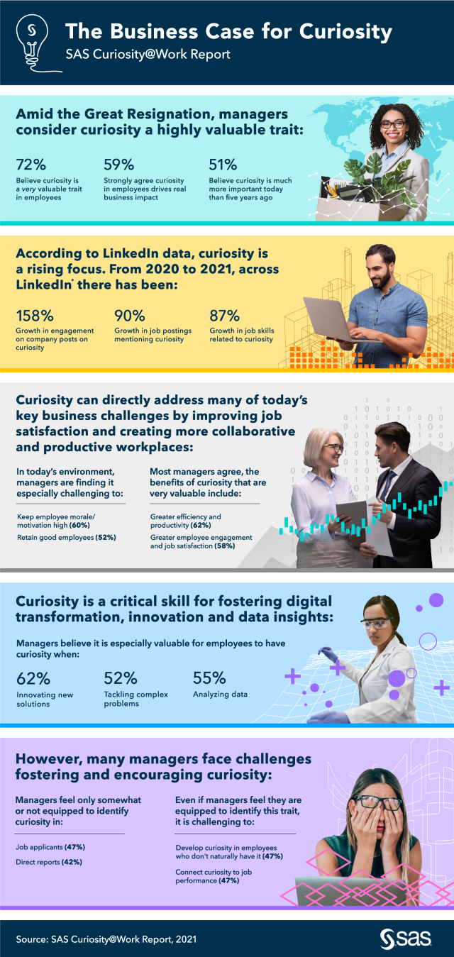 Nell’era della “Great Resignation”, l’aumento delle dimissioni dal posto di lavoro, la curiosità è sempre più riconosciuta dai business leader come un’abilità preziosa ed è sempre più ricercata dai datori di lavoro per affrontare alcune delle più grandi sfide delle aziende – dal miglioramento della retention dei dipendenti e della soddisfazione sul lavoro, alla creazione di ambienti di lavoro più innovativi, collaborativi e produttivi. Tutto questo è riportato nel SAS Curiosity@Work Report, l’ultima ricerca condotta da SAS, basata su interviste a circa 2.000 manager a livello globale e sui dati provenienti da LinkedIn nell’ultimo anno.