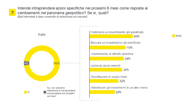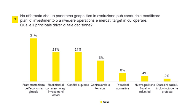Più in dettaglio, la revisione dei piani di investimento, delle operations o dei mercati in cui operare è dovuta principalmente, per il 31% dei CEO italiani, alla crescente frammentazione dell’economia globale, che si contrappone a uno scenario di globalizzazione alla base del funzionamento dei sistemi economici sino alla pandemia da Covid-19. A questo si aggiunge (per il 21% dei rispondenti) il timore di restrizioni al commercio o agli investimenti esteri. Allo stesso modo, anche i conflitti in corso hanno un impatto rilevante per il 21% degli intervistati.