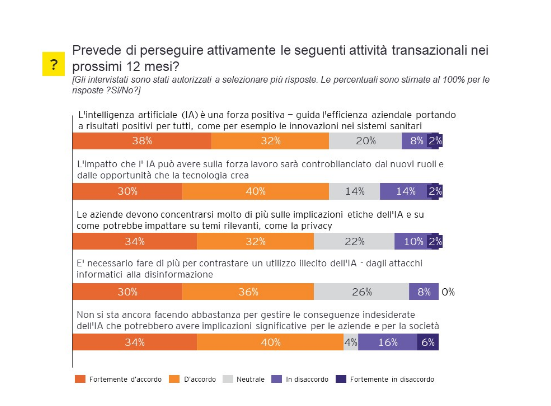 I CEO vedono chiaramente le enormi opportunità derivanti dall’applicazione dell’Intelligenza Artificiale (IA): il 70% degli intervistati in Italia (65% a livello global) ne riconosce il potenziale per migliorare la produttività, promuovere l’efficienza aziendale e creare quindi risultati positivi per la società (ad esempio le innovazioni nei trattamenti sanitari). La medesima percentuale (il 70% a livello Italia contro il 66% degli intervistati a livello globale) è d’accordo che l’impatto dell’IA sulla forza lavoro sarà controbilanciato dai nuovi ruoli e dalle nuove opportunità di carriera creati dalla tecnologia, respingendo i timori che l’IA possa avere un impatto negativo sull’occupazione.