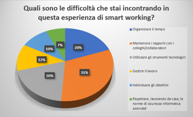 Come anticipato, tra le difficoltà riscontrate svetta su tutte le altre il rapporto con i colleghi/collaboratori, con le tradizionali riunioni “fisiche” che solo in parte possono essere sostituite dalle videoconferenze (anche per l’impreparazione tecnica di alcuni a utilizzare le più comuni piattaforme come Zoom, Teams ecc.).