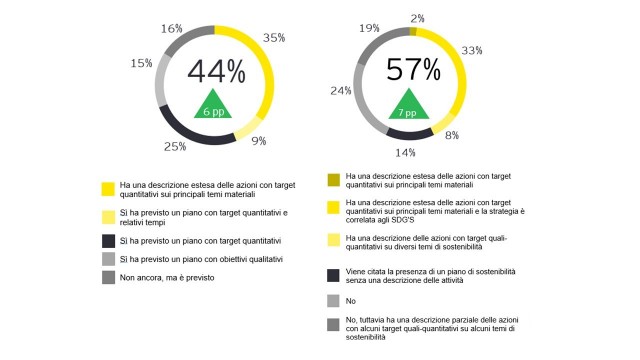Sulla base dei risultati della survey EY emerge che il 69% delle aziende intervistate abbia previsto un piano di sostenibilità corredato da obiettivi e nel 44% dei casi (aumento del 6% rispetto al 2019 anno pre-pandemico) siano stati formalizzati target quantitativi, mentre appena il 35% delle aziende ha definito anche le relative tempistiche per il raggiungimento degli obiettivi. Il 15% delle società analizzate, che non sono dotate attualmente di un piano di sostenibilità, dichiara di averne previsto lo sviluppo.