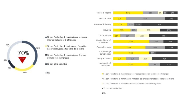 Nel campione considerato nell’analisi desk, il 19% (+3% rispetto all’anno precedente) dichiara di avere una strategia legata all’economia circolare associata ad obiettivi e target futuri. Tra queste aziende i settori più attivi risultano essere Textile & Apparel, Industrial e Energy & Utilities che insieme rappresentano il 50% delle aziende che hanno definito una strategia di economia circolare. Il 46% delle aziende implementa iniziative legate all’economia circolare ma tra queste solo il 20% applica un approccio di settore o di territorio (superando il perimetro aziendale), ovvero più strutturato.