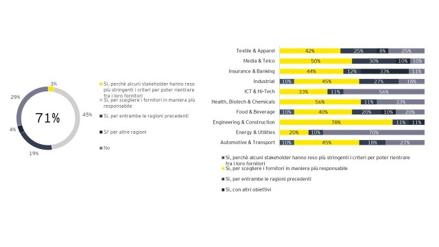 Il 71% delle aziende intervistate ha previsto di apportare modifiche rispetto ai precedenti anni alla propria catena di fornitura: nello specifico il 45% con la finalità di selezionare i propri fornitori in modo più responsabile, il 3% in quanto alcuni stakeholder hanno reso più stringenti i criteri di selezione, il 19% per entrambe le precedenti motivazioni.