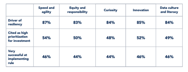 I dati da soli non bastano; è necessario saperli organizzare e analizzare affinché possano indirizzare al meglio le strategie di resilienza e, a conferma di ciò, oltre il 90% degli executive ritiene che dati e analytics siano fondamentali per ognuna delle regole di resilienza.
