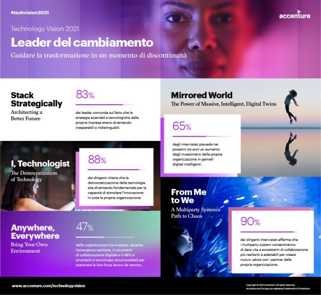 “Il rapporto conflittuale che si era creato tra uomo e tecnologia è stato completamente ridefinito dalla pandemia in un’ottica di necessità, condensando in un anno un intero decennio di progresso digitale. Il 2020 ha messo in luce il messaggio centrale della Technology Vision di quest’anno, ovvero che ogni business è un business tecnologico e che in questa era di profonda trasformazione la tecnologia sta riplasmando interi settori come anche l’esperienza umana”, dichiara Valerio Romano, Cloud First Lead di Accenture. “La strategia aziendale e quella tecnologica sono ormai inseparabili e la capacità di guidare il cambiamento continuo spinto da un’innovazione tecnologica esponenziale è la caratteristica principale dei leader del futuro. Abbiamo oggi un’opportunità irripetibile per trasformare questo momento cruciale in una prova di fiducia e in nuove possibilità, sfruttando la costante evoluzione tecnologica ed imprimendo una forte accelerazione del ritmo di adozione”.