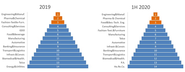 - 2019 e prima metà 2020: i settori in cui si concentrano le ricerche di personale. con l’avvento del Covid-19, nella prima metà 2020, l’area Engineering & Manufacturing conferma la prima posizione. Il settore Food&Beverage acquisisce sempre maggiore importanza, mentre il Farmaceutico & Chimico conferma la propria posizione mantenendo il secondo posto in classifica.