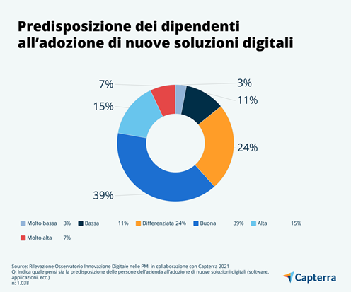 La componente umana, come dicevamo prima, è un fattore determinante nel processo di digitalizzazione di un’azienda, qualsiasi siano le sue dimensioni. Non basta introdurre delle nuove piattaforme per velocizzare i processi di business. I software devono poter essere utilizzati dai dipendenti per svolgere il loro lavoro al meglio e per questo è stata indagata la predisposizione dei collaboratori al cambiamento in questo contesto: