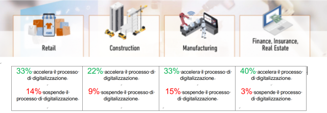 I settori che prima della pandemia avevano rallentato processi di automazione, ora stanno recuperando. I settori della finanza, delle assicurazioni, immobiliare e dei servizi alle imprese stanno raddoppiando l’impegno per implementare processi di digitalizzazione come conseguenza della crisi, in particolare per quanto riguarda le mansioni amministrative e a contatto con il pubblico.