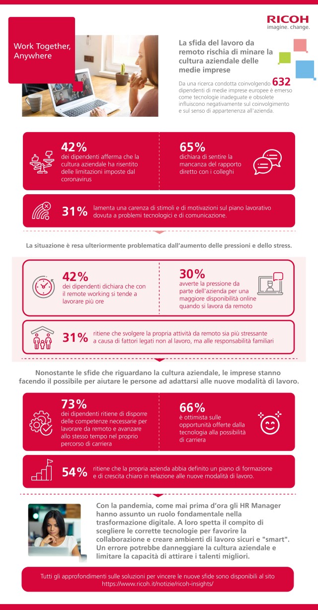 Nicola Downing, COO di Ricoh Europe, commenta: “Il 2020 ci ha messo di fronte a cambiamenti dirompenti e la capacità collettiva di reagire e di adattarsi è stata veramente degna di lode. Per le organizzazioni è importante riuscire a innovare e a migliorare l’esperienza lavorativa delle persone affinché possano collaborare in modo smart, sia che svolgano le proprie attività da casa oppure in ufficio. Le tecnologie permettono di farlo, annullando le distanze. Dalla ricerca Ricoh emerge come la possibilità di lavorare in ufficio insieme ai colleghi rappresenti per molti un aspetto essenziale della vita quotidiana. Ecco perché è importante per le aziende favorire il rientro in ufficio mediante, da un lato, la creazione di ambienti di lavoro in cui salute e sicurezza sono la priorità e, dall’altro, il coinvolgimento delle persone per comprenderne i bisogni e le necessità”.