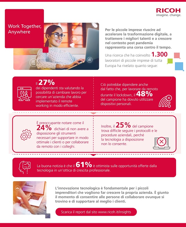 David Mills, CEO di Ricoh Europe, commenta: “Se prima la trasformazione digitale poteva essere inclusa nei progetti a lungo termine, ora è diventata essenziale per la ripresa e la crescita delle piccole imprese. Senza le tecnologie che consentono ai dipendenti di lavorare in sicurezza ovunque si trovino, le aziende rischiano di perdere i migliori talenti. Sono le persone a fare la differenza e se queste passano alla concorrenza il rischio è quello di perdere anche clienti. I temi da affrontare per le piccole imprese sono davvero molteplici. Le priorità sono di certo cambiate nel corso del 2020 e l’innovazione tecnologica può aiutare queste aziende a superare le crisi e a rafforzare il business”.
